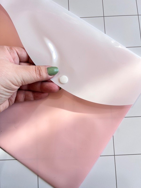 Sobre plástico listo con broche y solapa atrás para también guardar cosas.