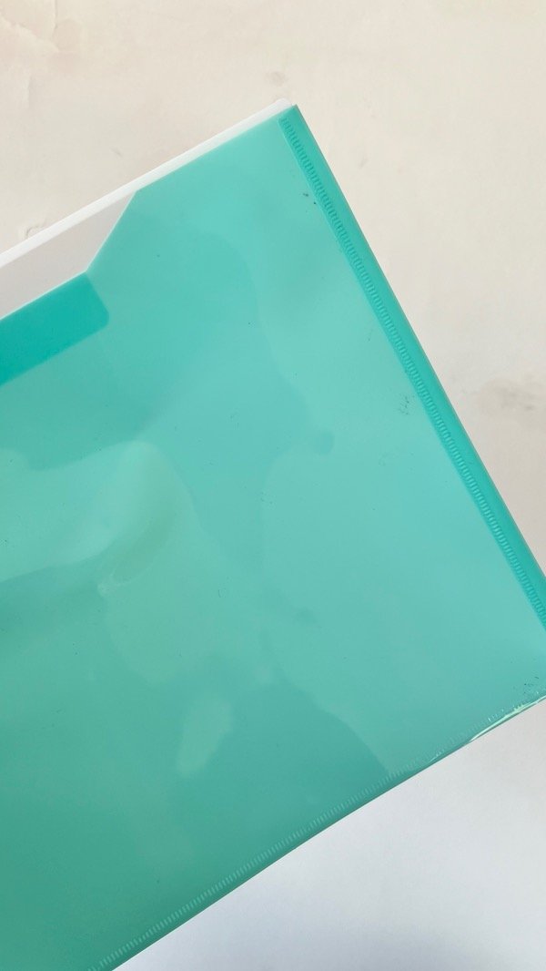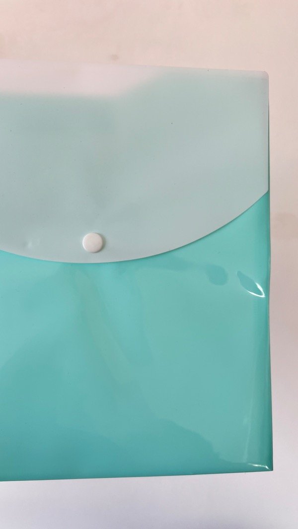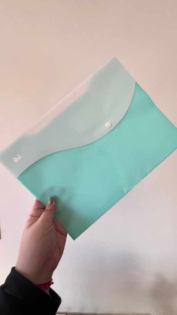 Sobre plástico listo con broche y solapa atrás para también guardar cosas.